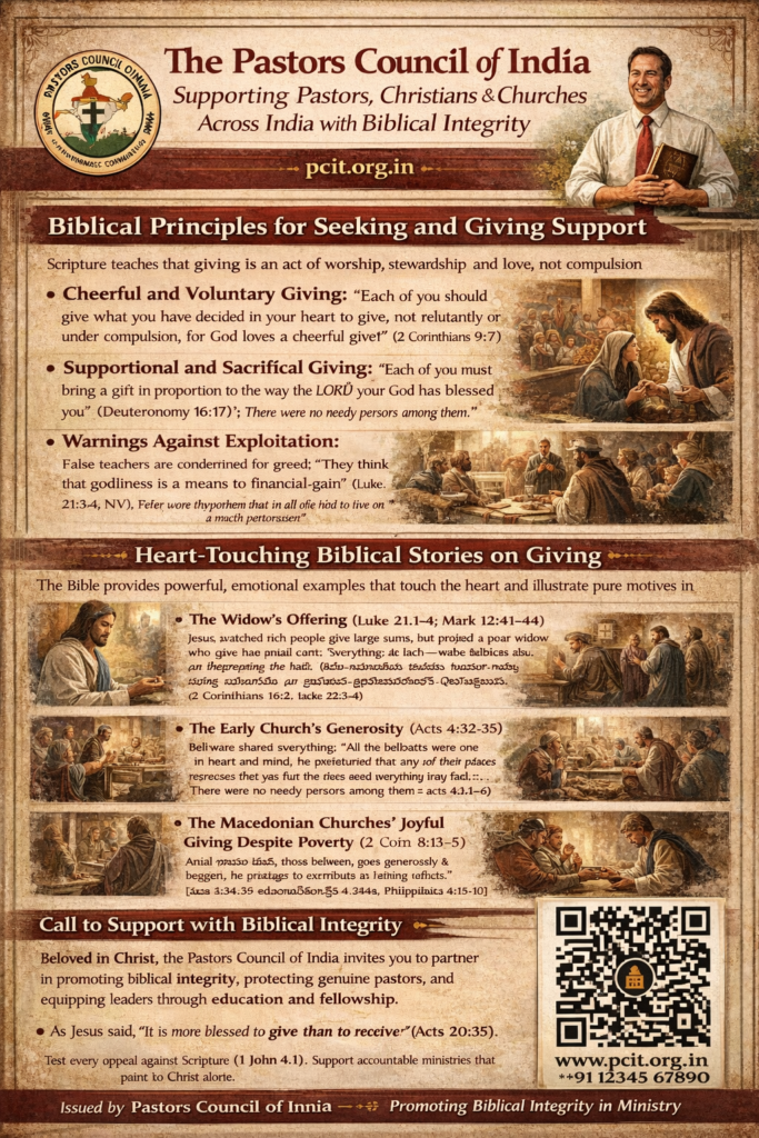 Genuine ministry appeals—like those from accountable bodies such as the Pastors Council of India—focus on advancing Christ’s kingdom, equipping pastors, evangelists, church members, and Bible college lecturers through training, protection, and fellowship.